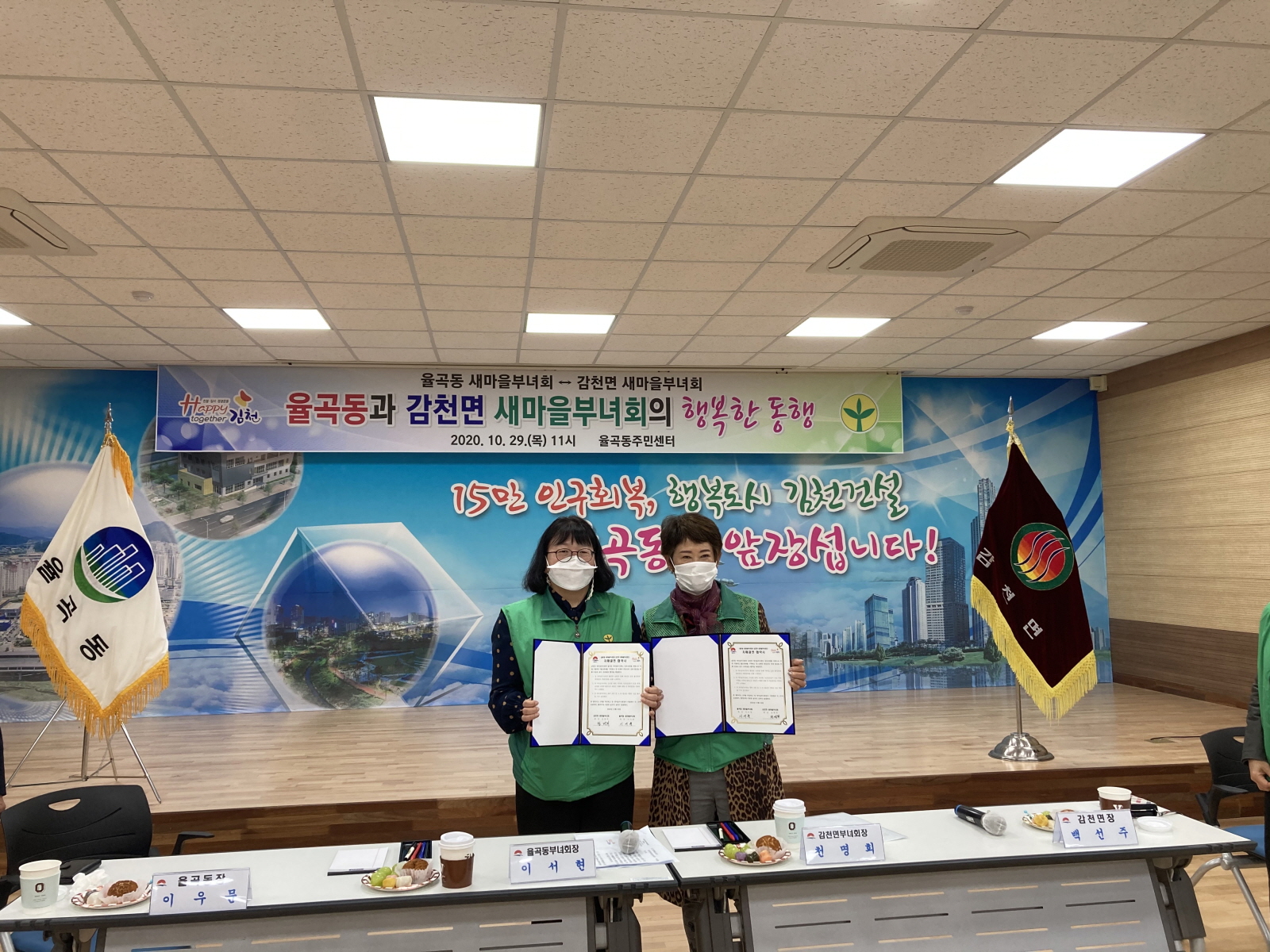 | 김천시 율곡동(동장 이우문)은 10월 29일 주민센터 2층 회의실에서 율곡동 새마을 부녀회와 감천면 새마을부녀회의 자매결연 협약식을 개최했다.