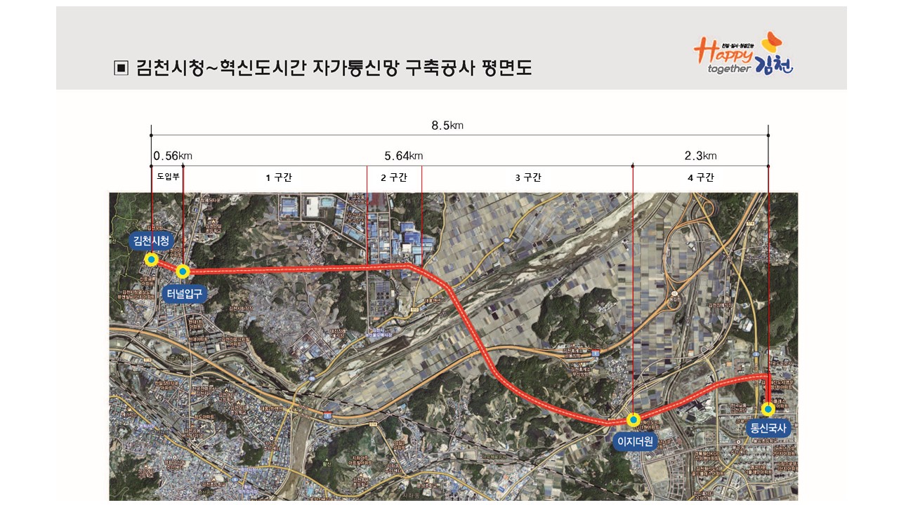 시청 통신실과 혁신도시 통신국사간 8.5㎞를 광케이블 72코어로 구축하는 자가통신망 구축사업은 단독으로 추진할 경우 많은 사업비 소요, 도로 굴착에 따른 시민불편, 각종 민원야기 등 여러 가지 어려움이 있다. 하지만 김천시는 『Happy together 김천』운동 실천을 통한 기관·부서간 소통 및 협업으로 이러한 어려움과 문제점을 해결했다.