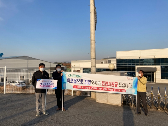 | 아포읍은 30일 오전 7시 50분부터 관내 기업체 프로트로닉스 김천공장 입구에서 「김천 愛 주소갖기」홍보를 위한 인구 증가 캠페인을 실시하여 아포읍장 및 직원일동은 출근하는 기업체 근로자를 대상으로 현수막과 피켓을 통하여 「김천愛 주소 갖기」운동 및 전입지원금 등을 안내하여 인구 전입을 독려하였다.