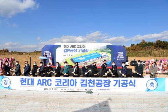 | ㈜현대ARC코리아는 11월 3일 김천일반산업단지 공장 부지에서 이철우 경북도지사, 김충섭 김천시장, 현대글로벌모터스 대표, 미국ARC 한국지사장 등 30여명이 참석한 가운데 자동차 첨단 신소재 생산공장 신축을 위한 기공식을 개최하였다.