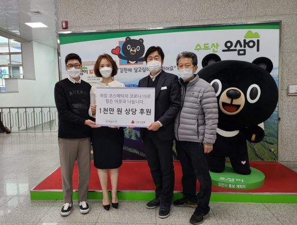 | 지난 3일 하킴코스메틱(대표 하지숙)은 김천시를 방문해 1,000만원 상당의 스킨케어제품 264세트를 전달했다.