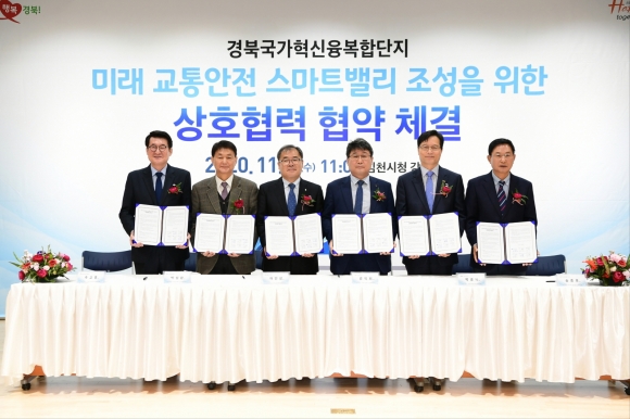 | 경북 국가혁신융복합단지 협력체계 구축을 목적으로 한 『미래 교통안전 스마트밸리』조성 업무협약이 김천시청 3층 강당에서 진행되었다.