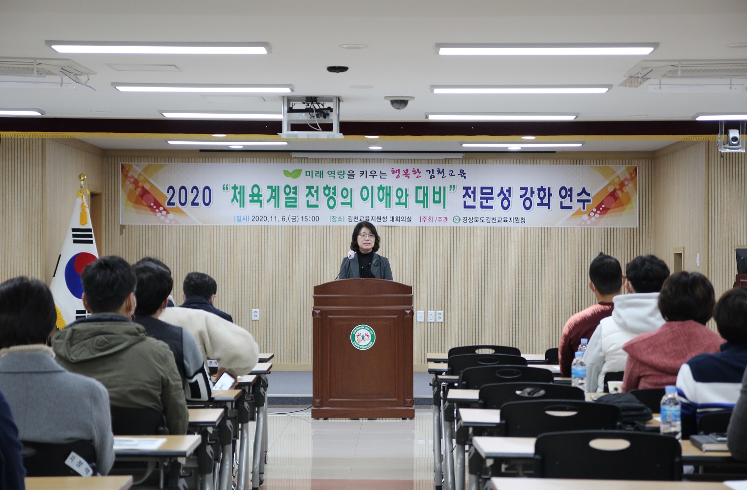| 경상북도김천교육지원청(교육장 마숙자)은 11월 6일(금) 오후 15시 김천교육지원청 대회의실에서 도내 중·고 체육교사 및 체육전공 전문직 50명을 대상으로 ‘2020 체육계열 전형의 이해와 대비’를 주제로 전문성 강화 연수를 개최하였다.