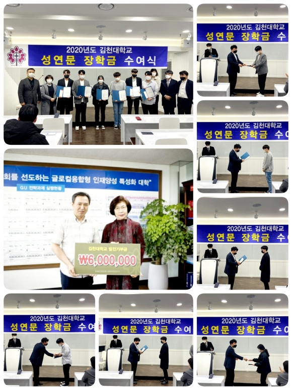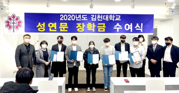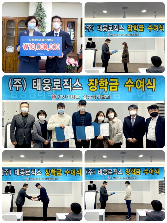 김천대 임상병리학과 김수환 교수의 사회로 진행된 장학금 수여식은 먼저, 김천의료원 성연문 진료처장의 지속적 학과 장학금 기부로 마련된 성연문장학금을 나찬흠학생을 비롯한 6명의 학생에게 전달되었고, 이어서 2020년부터 새롭게 지원되는 ㈜ 태웅로직스(대표이사 한재동) 장학금이 고보빈 학생을 비롯한 3명의 학생에게 수여되었다.