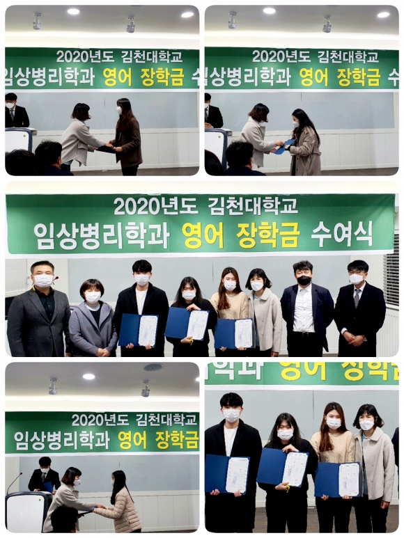 | 풍성한 학과 장학금을 지속적으로 유치하여 온 김천대(총장 윤옥현) 임상병리학과가 2020년 장학금 수여식을 11월 10일(화) 오후 2시 보건과학관 그레이스홀에서 코로나19로 인해 최소 인원인 수여학생과 학과 교수 및 학과 학생임원들이 참석한 가운데 열렸다.