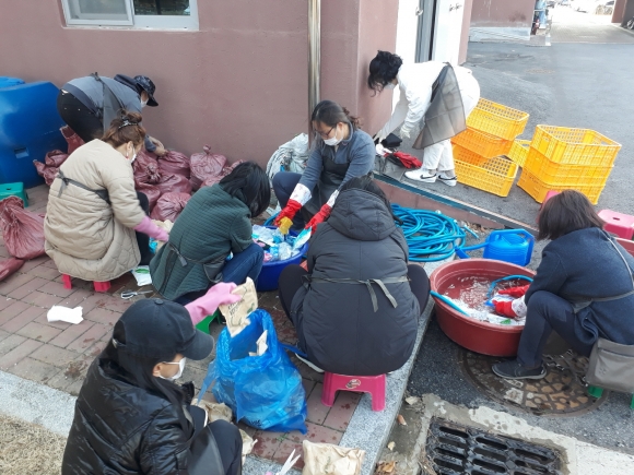 | 김천시 율곡동(동장 이우문)에서는 지난 11월1일부터 동사무소 현관에 아이스팩 수거함을 만들어 놓고부터 새마을 부녀회원들의 손길이 분주해졌다. 주민들이 자발적으로 수거함을 채워주고 채워진 아이스팩은 매주 1회 새마을부녀회원들이 윤번제를 통해 세척과 소독과정을 거치고 건조까지 해서 다시 공짜로 가져가는 함에 채워야 되기 때문이다.