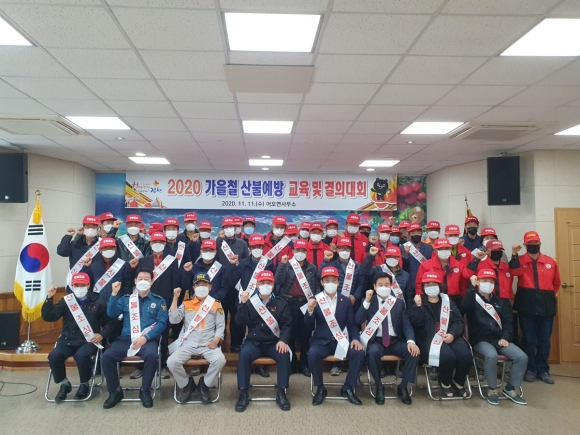 | 김천시 어모면(면장 이병헌)은 2020년 가을철 산불조심 기간이 도래함에 따라 11일 11시 30분 면사무소 2층 회의실에서 가을철 산불예방을 위한 산불 예방교육 및 결의대회를 개최했다.