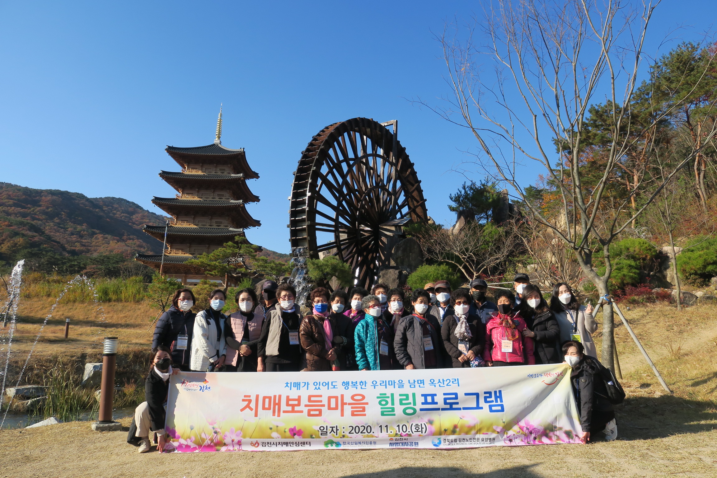 | 김천시는 11월 10일 사회적 거리두기 1단계로 완화됨에 따라 외부활동이 어려웠던 치매보듬마을(남면 옥산2리) 치매어르신과 가족, 주민 15명을 대상으로 국립김천치유의숲과 사명대사공원에서 힐링프로그램을 운영하였다.