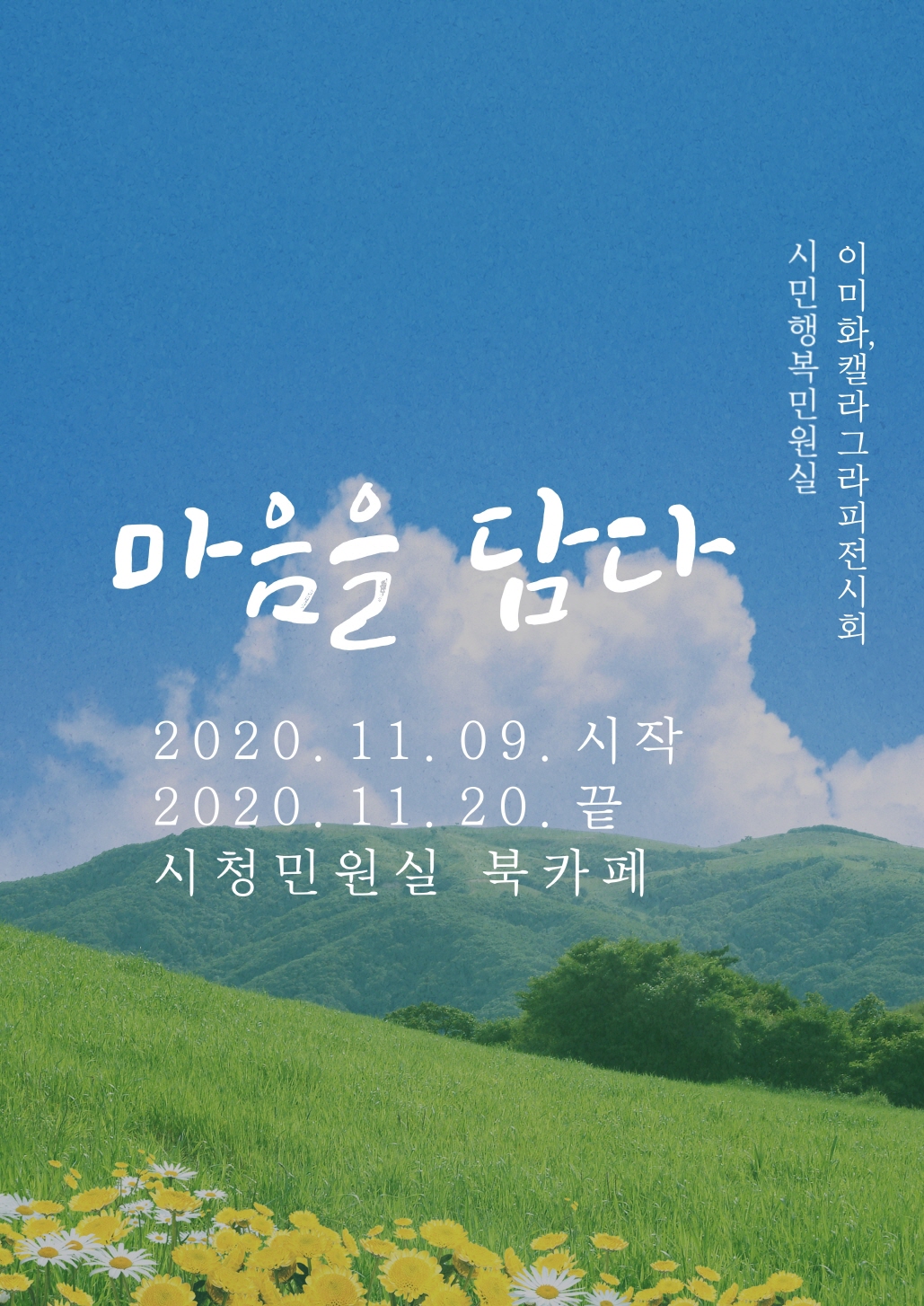 | 김천시(시장 김충섭)는 11월 9일(월)부터 11월 20일(금)까지 김천시청 열린민원실내 북카페에서 이미화작가의 캘리그라피 전‘마음을 담다’를 개최한다고 밝혔다.