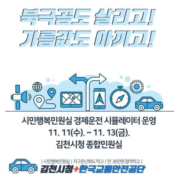 | 김천시 열린민원과(과장 장성윤)에서는 한국교통안전공단과 함께 스크린을 보며 가상도로를 주행하는 과정에서 자신의 운전방법 전·후를 비교하여 잘못된 운전습관을 교정할 수 있는 ‘시민행복민원실 친환경·경제운전 시뮬레이터’를 운영한다. 시뮬레이터는 종합민원실 내 로비에서 11월 11일(수) ~ 13일(금) 3일간 운영한다.