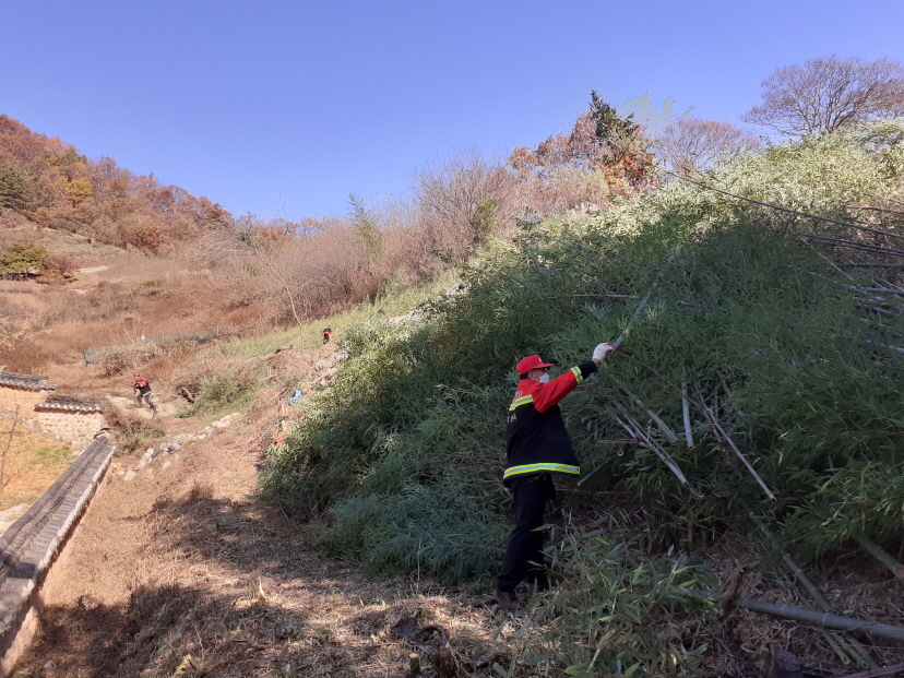 | 지례면은 11월 10일 ~ 11일(2일간) 산불예방전문진화대 20명 동원하여 지례향교(지례면 교1리 소재) 인접 산림 인화물질(대나무 등)을 제거하였다.