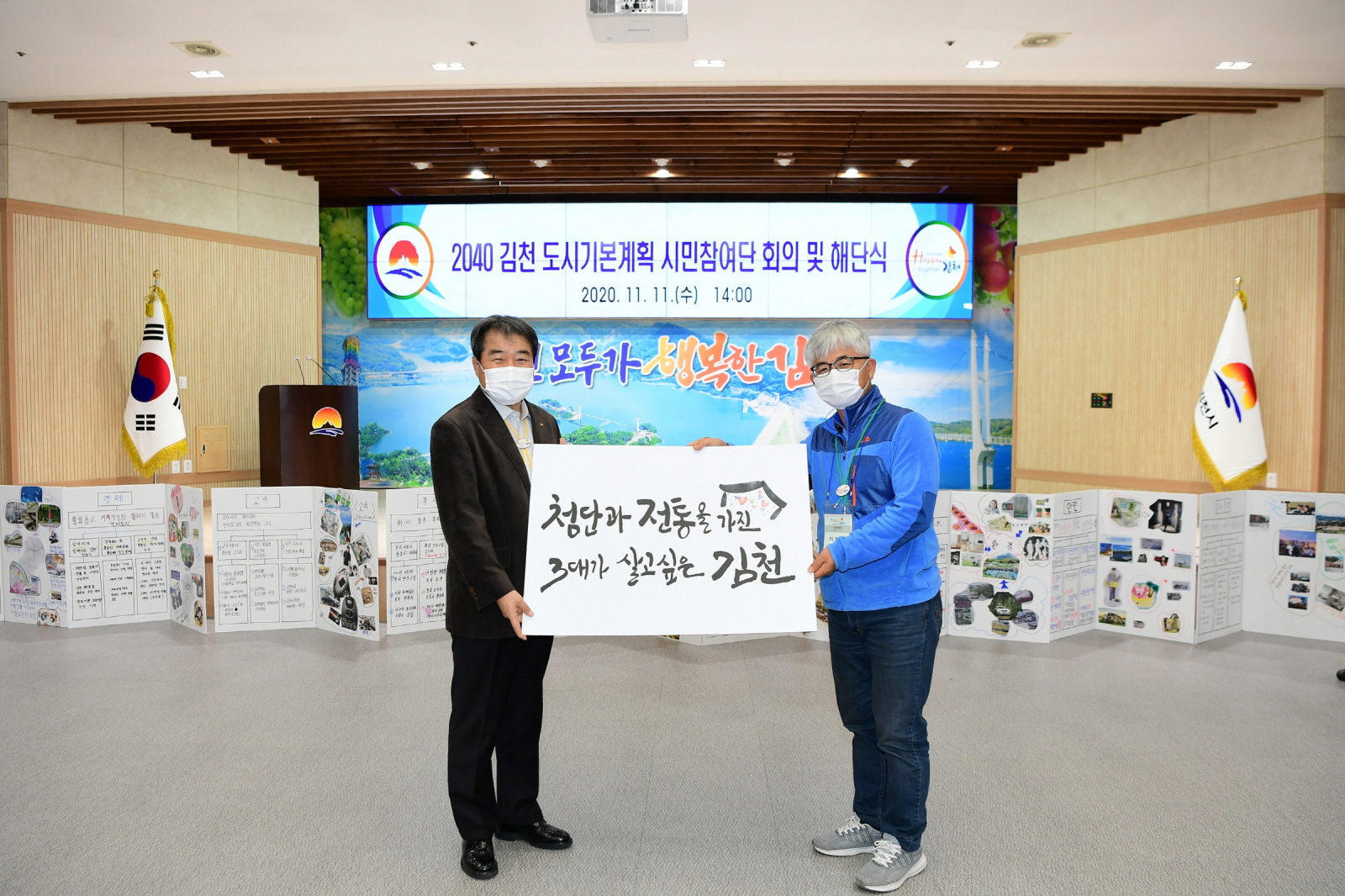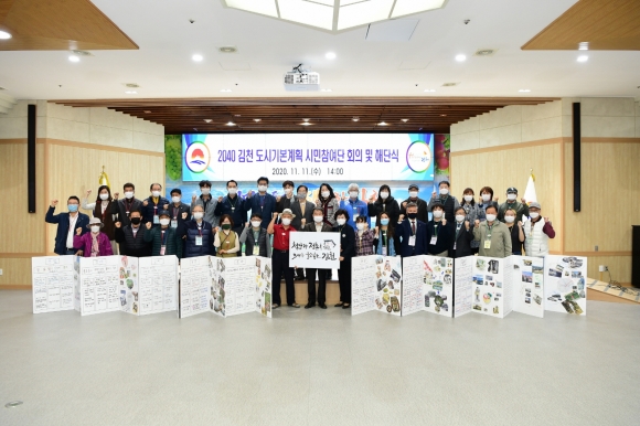 | 김천시의 미래 발전 방향을 정하는 2040 김천 도시기본계획 5개분과 시민참여단은 2020. 11. 11.(수) 김천시청 3층 강당에서 4차 회의 및 해단식을 갖고 4주간의 활동을 성공적으로 마무리 했다. 이날 시민참여단은 4주간의 회의를 통해 도출된 김천시 미래상을 김충섭 김천시장에게 전달하는 행사를 가지고 김천시민들의 생생한 목소리를 전달했다.