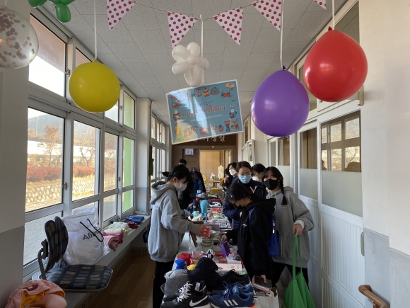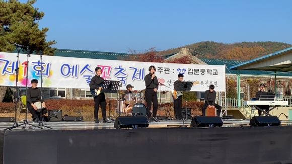 | 김천 감문중(교장 황경연)은 2020년 11월 12일(목) 교내에서“예술꽃 축제”를 실시하였다. 이 행사는 “예술꽃 씨앗학교 사업”의 일환으로 1부 부스 운영, 2부 공연으로 이루어졌다. 올 한 해 동안 본교의 다양하고 심화된 교과연계형 예술문화 활동을 통해 개발한 학생들의 소질과 능력을 선보이는 시간이었다. 본 행사는 11월 12일(목)에 교실 및 본교 교정에서 전교생, 교직원 및 학부모 등이 참여한 가운데 1부 부스 운영, 2부 공연으로 진행되었다. 1부는 ‘나눔’이라는 주제로 학생, 교사, 학부모가 모두 참여하는 10개의 체험부스 운영으로 이루어졌다. 부스 활동으로는 학부모 운영 부스인 ▲플라워 테라피 ▲토분 그리기 ▲먹거리장터와 교사와 학생들이 함께 운영한 ▲내 입속의 과학 ▲네일아트 ▲e-스포츠대회 ▲아나바다 ▲전통놀이 ▲천연화장품 만들기 ▲추억사진 남기기가 있었다. 학생들은 다양한 부스에 지원하여 끼를 발산하고 호응하며 적극적으로 참여하였다.