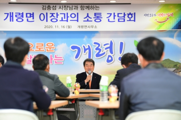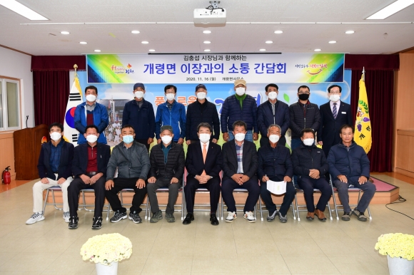 | 김충섭 김천시장은 11월 16일 개령면사무소에서 이장들과 함께 코로나19극복과 격의없는 대화로 지역발전 방향을 논의하는 화합과 소통을 위한 간담회를 개최하였다.
