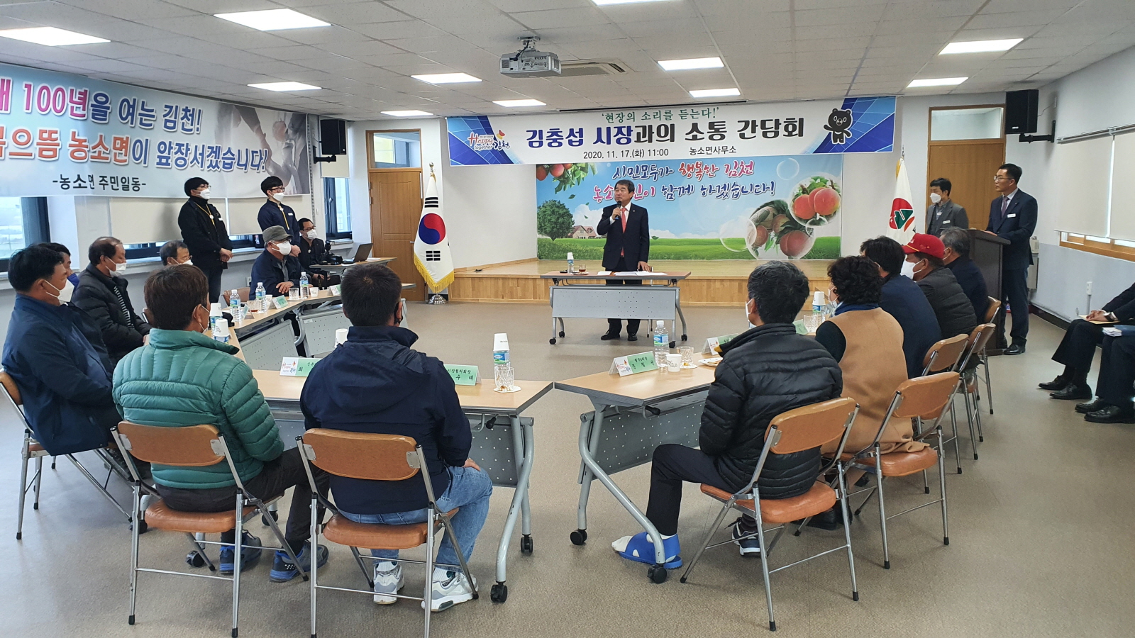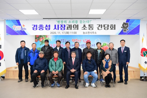 | 김천시(시장 김충섭)는 11월 17일(화) 농소면사무소 2층 회의실에서 12명의 이장들과 함께 현장의 생생한 목소리를 듣고자 소통 간담회를 개최하였다. 이번 간담회는 코로나19 장기화로 인한 소통의 부재를 해소하고 행정의 최일선에서 헌신하고 있는 이장들을 격려하는 한편, 현안 사업에 대한 여론 및 각종 애로사항을 청취하고 시정에 반영함으로써 소통행정을 구현하고자 마련되었다.