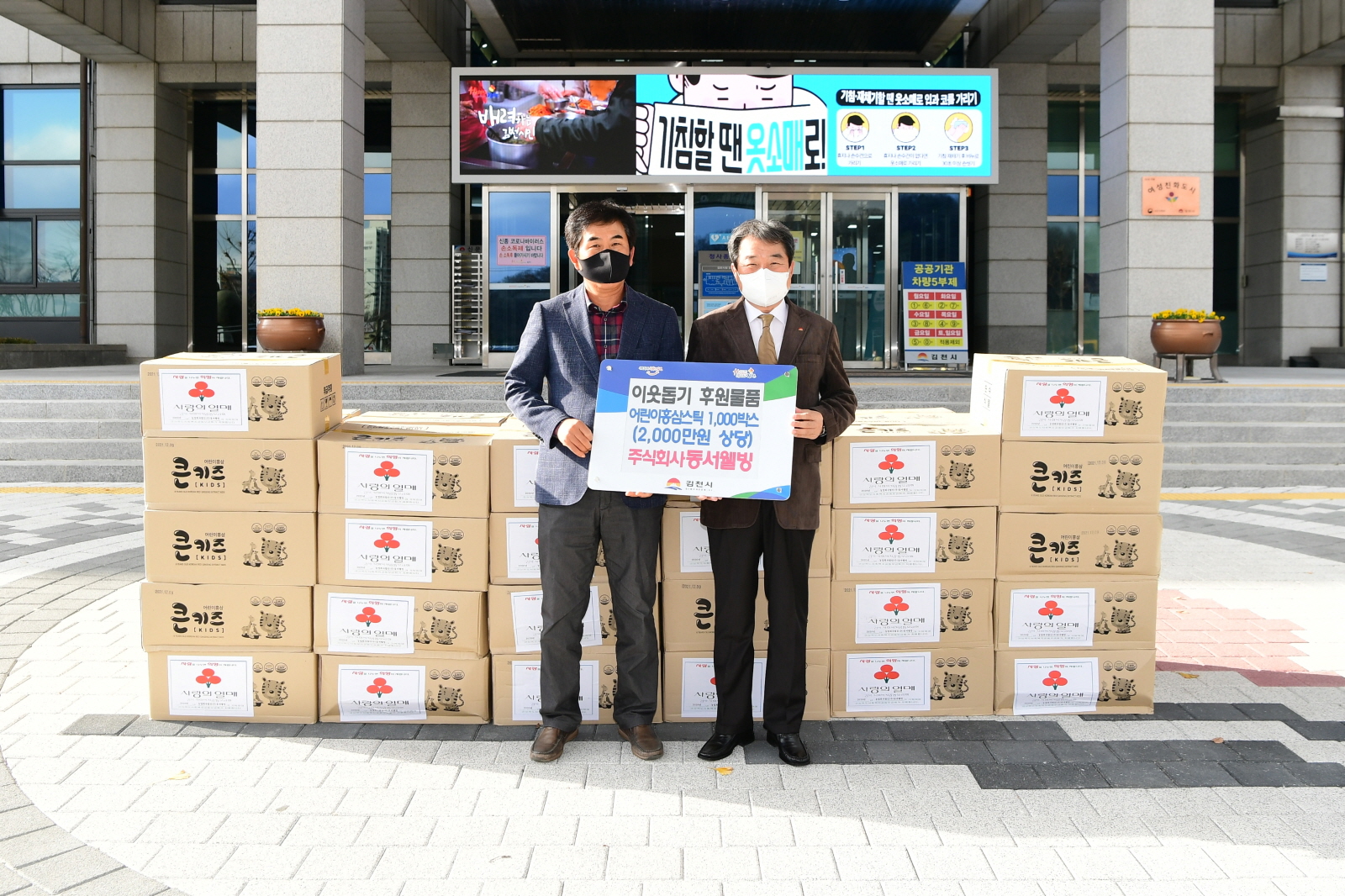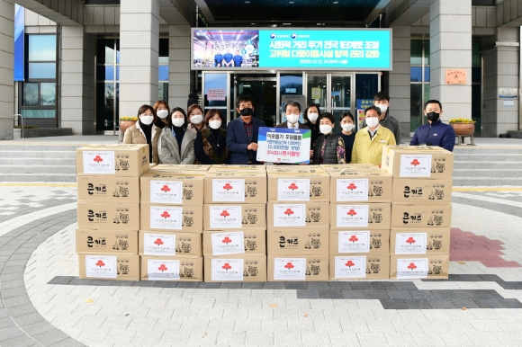 | 11월 20일 농업회사법인(주) 동서웰빙(대표 최경자)은 김천시를 방문해 2,000만원 상당의 기능성 홍삼스틱제품 1,000박스를 전달했다.
