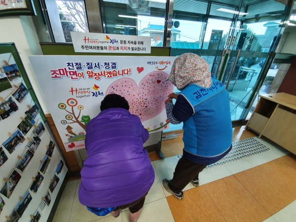 | 김천시 조마면(면장 위성충)은 연말을 맞아 조마면 1년을 되돌아보는 “Happy togetehr 김천”운동 포토 갤러리 전시와 면사무소를 방문하는 민원인들을 대상으로“함께 운동에 참여하자는 의미가 담긴 스티커 붙이기”결산을 실시하였다.