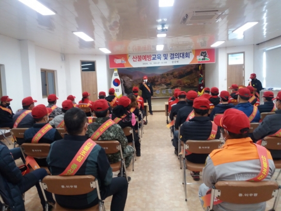 이날 실시한 다짐대회는 코로나19를 예방하기 위한 철저한 방역과 소독작업을 실시한 후에 진행되었으며 주민대표로 정 성경(산불감시원)씨의 결의문 선서와 함께 참석 주민들의 산불예방에 적극 동참하겠다는 의지가 넘쳐나는 대회가 되었다.