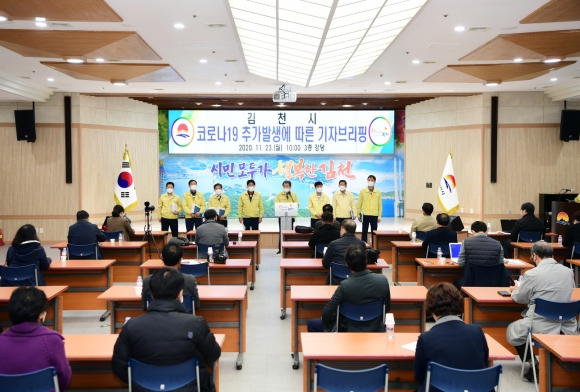 | 김천시(시장 김충섭)는 코로나19 확진자가 지난 19일부터 21일까지 3일간 16명이 발생함에 따라 추가확산을 방지하기 위하여 23일 오전 10시에 시청 회의실에서 브리핑을 가졌다. 브리핑에 앞서 오전 9시에 2층 회의실에서 교육지원청, 경찰서, 소방서, 건강보험공단, 관내대학 및 병원관계자 등 유관기관이 참석한 가운데 코로나19 확산방지 및 향후 추진 방안에 대한 논의를 위하여 김천시 재난안전대책본부 대책회의를 개최하였다. 코로나19가 본격화된 올해 초부터 현재까지 김천시는 12,666명을 검사하였고, 그중 42명의 확진자가 발생하였고, 나머지 12,624명은 음성 판정을 받았으며 현재 797명 검사 중이다. 최근 발생 상황을 사례별로 살펴보면, 지난 19일 발생한 해외입국자 3명은 일가족으로 11월 7일 입국당시 음성으로 판정되었으나, 자가 격리 중 11월 18일 증상발현이 있어 검사한 결과 양성으로 판정되어 대구의료원으로 입원조치 하였고 관내 대학교에서 발생한 11월 19일 확진자 3명 중 2명은 현장실습을 위해 검사한 결과 확진되었고 나머지 1명은 타지역 통학생으로 발열증상이 있어 관내 병원에서 검사한 결과 확진 판정되었으며, 확진자와 대학 내 교실 및 헬스장 등의 접촉자 103명에 대하여 검사한 결과 6명은 양성, 97명 음성판정을 받았다.