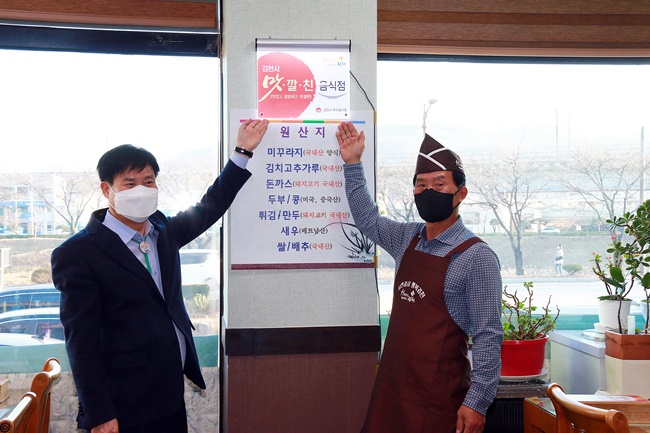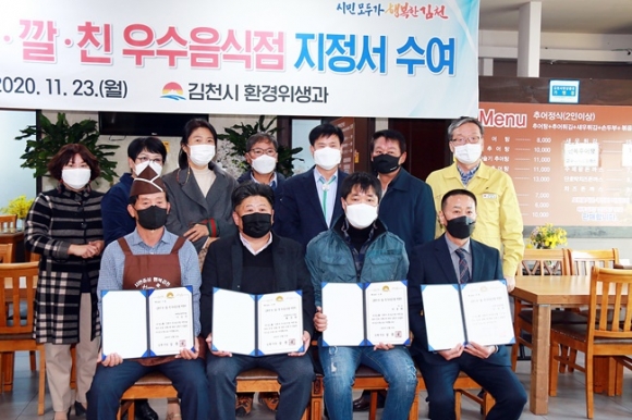 |  | | | ⓒ 김천내일신문 | | 김천시는 지난11월23 신음동 ‘백세 남원추어탕’ 식당에서 김천의 맛과 멋을 담고 있으면서 “Happy together 김천” 운동을 모범적으로 실천하는 2020년 하반기 “김천시 맛·깔·친(맛있고 깔끔하고 친절한 업소) 우수음식점” 4개소를 선정하여 지정서를 수여하였다. “맛·깔·친 우수음식점” 은 지역 대표 음식점 발굴을 위한 김천시 자체사업으로 우수 음식점 지정 기준에 따라 서면평가와 전문위원이 참가한 2차 현장심사를 통하여 최종 선정되었다. 선정기준으로 맛의 대중성, 메뉴의 전문성 및 차별화, 식재료의 신선도, 영업장 청결상태, 종사자의 친절도이며, 2020년 하반기는 신음동 백세남원추어탕, 농소면 김천(서울방향)휴게소한식당, 아포읍 뚝심, 재동이보리밥이 선정되어 인증서 수여와 현판 지원, 위생용품 구입 및 업소 시설보수 지원 등 200만원 상당의 재정지원의 혜택과 맛집 책자, 온라인 매체 표출 등 다양한 혜택이 주어진다. 수여식에서 김재광 부시장은 “Happay together 김천의 실천을 위해서 친절, 질서, 청결을 모범적으로 실천하면서 음식에 맛과 멋을 담은 음식점을 선정했다. 맛·깔·친 음식점 지정을 통해 지역의 대표음식점으로 발굴·육성되고 우리시를 찾는 관광객들에게 음식관광 콘텐츠로 활용하겠다. 김천시 대표음식점이라는 소명을 갖고 명성 유지에 최선을 다해 주실 것을 당부하였다.” |  | | | ⓒ 김천내일신문 | | |