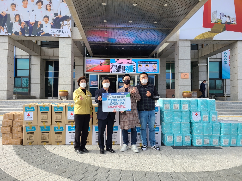 | ㈜카일라스는 지난 24일 김천시를 방문해 화장지, 물티슈, 각티슈, 키친타월 400개(200만원 상당)를 전달했다.