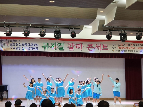 | 김천동신초등학교부설 지역공동 음악영재학급(교장 이미영)은11월20일(금) 학생문화예술센터에서 뮤지컬 갈라 콘서트를 열었다. 이 날 학생들은 그동안 열심히 연습하며 준비한 실력을 마음껏 발휘하여 큰 박수를 받았다.
