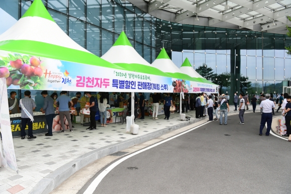 지난 7월 3일 한국전력기술 전정에서 개최한‘김천자두 특별판매행사’는 워크스루 방식으로 마스크를 착용하고 손소독제를 비치하는 등 생활 속 방역을 유지한 가운데 진행하였으며, 현장에서 김천자두(3kg) 2,000박스, 사전 주문으로 10,000박스를 판매했다.