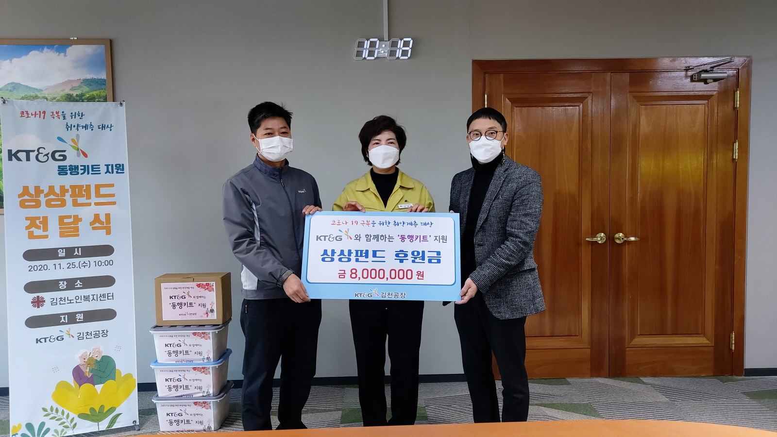 민웅기 KT&G김천공장장은 “코로나19 극복을 위해 사회적거리두기는 준수하되 항상 따뜻한 마음을 가지고 소외계층에게 다가가 지역복지에 기여할 수 있는 기업이 되도록 아낌없는 후원을 이어가겠다.”고 말했다. 김경희 김천시 복지기획과장은 “지역복지향상에 선도적인 역할을 하고 있는 KT&G김천공장에 감사드리며, 어려운 이웃을 생각하는 마음이 동행키트와 함께 잘 전달되길 바란다.”고 밝혔다.