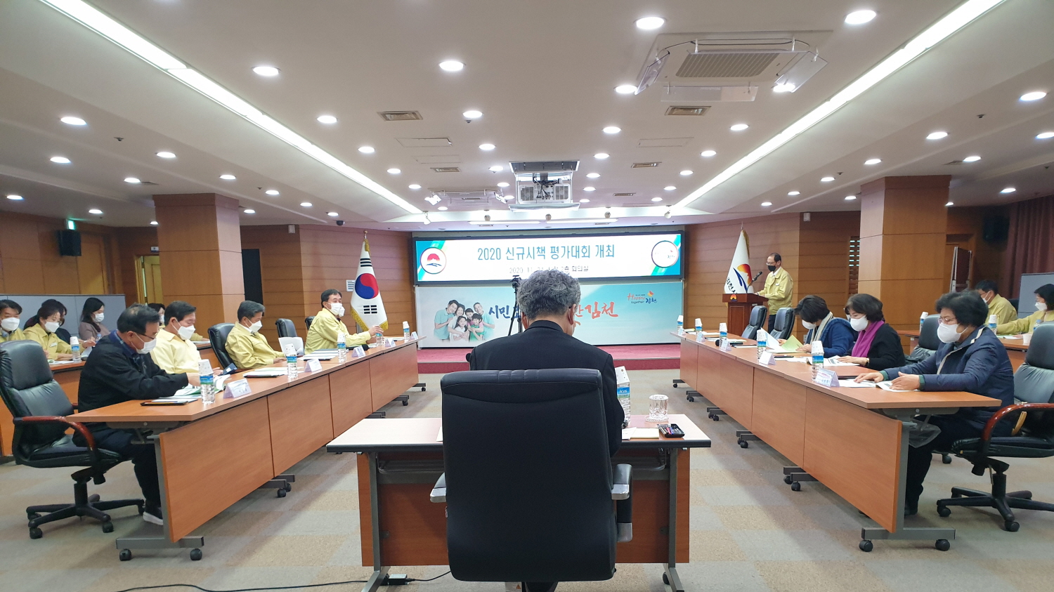 | 김천시(시장 김충섭)는 24일 오후2시 2층 회의실에서, 각 부서에서 2020년에 추진한 신규시책을 대상으로 김천시 주요업무평가위원 및 추진부서 발표자 12명이 참석한 가운데 「2020년도 신규시책 평가대회」를 가졌다.