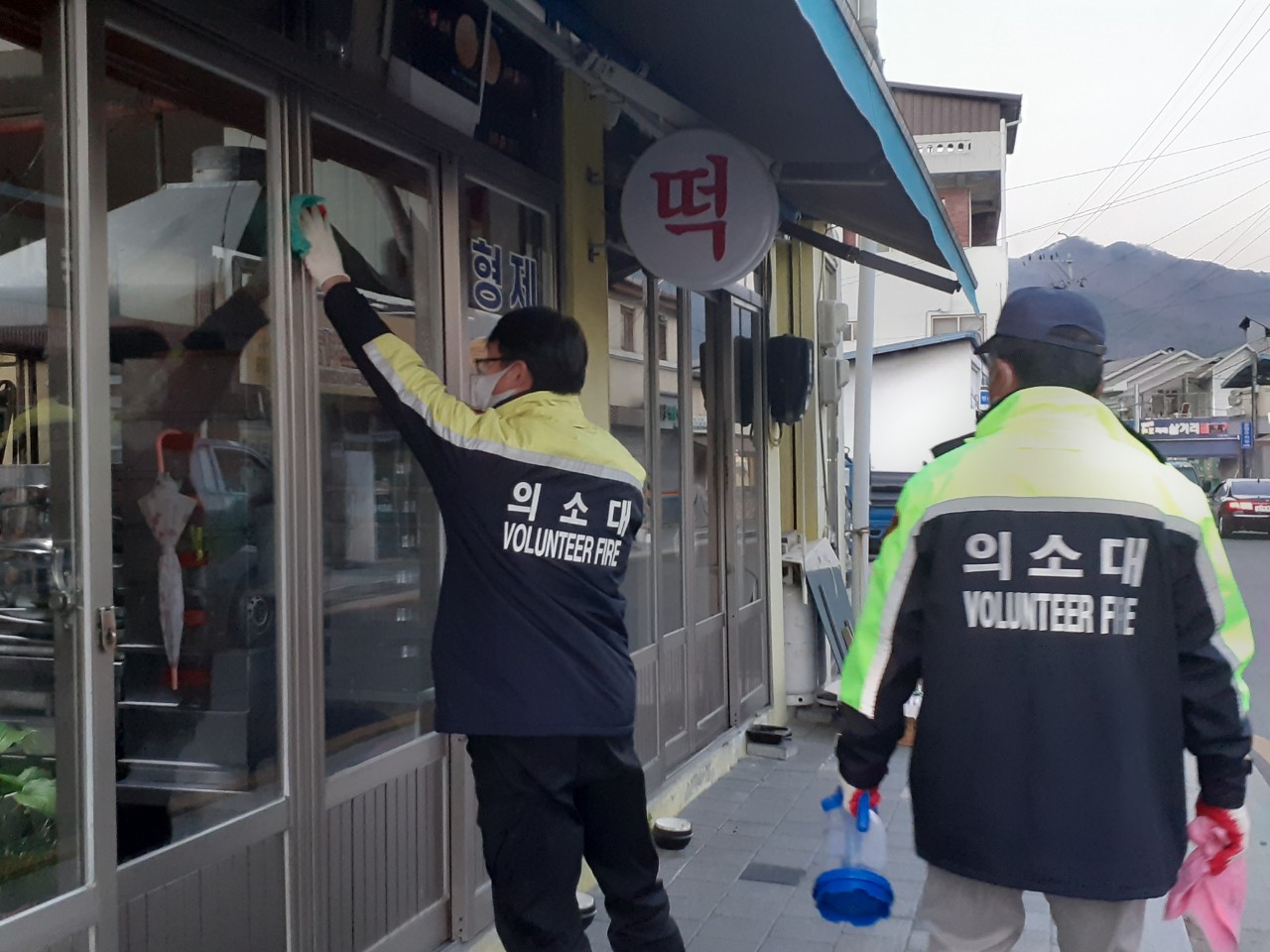 현업으로 바쁜 와중에도 오후 늦은 시간에 모인 지례면 남성의용소방대원들은 두 개의 조로 나누어 교리 및 상부리의 상가들과 방문객이 많은 대산농협지례지점 등 다중이용 시설을 집중적으로 방역하였다.