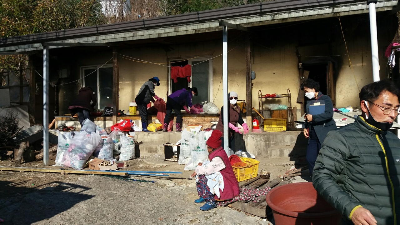 | 독도사랑국민연합(사무국장 유종철)은 지난 11월 26일 회원 6명과 함께 독거노인 가구를 방문하여 대청소를 실시하고, 코로나 19 감염 예방을 위하여 집안 구석구석을 돌며 방역을 실시하였다. 사례관리대상자인 노인은 매우 열악한 가정환경에서 생활하시는 치매환자로 돌봐줄 가족이 없어 일상생활 유지에 어려움이 많아 마을 이장님의 추천으로 사례관리대상자로 선정하게 되었다.