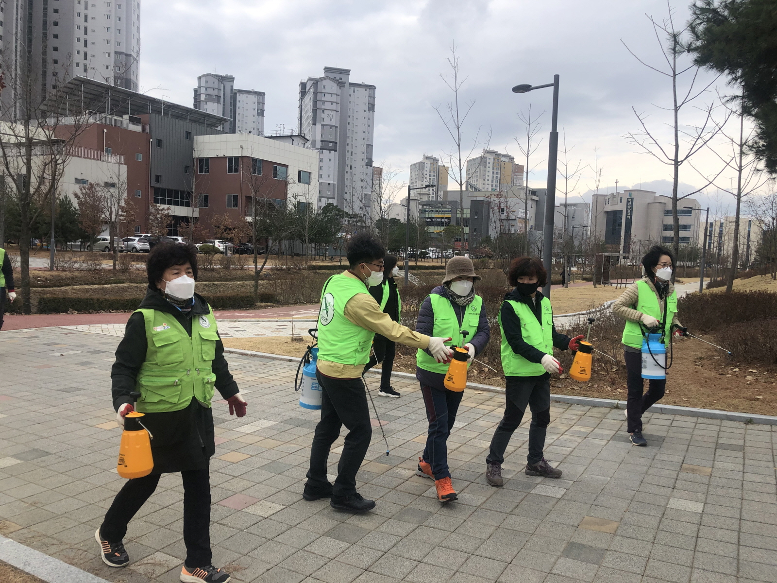 | 김천시 율곡동자연보호협의회(회장 오애순) 회원 10여명은 11월 27일 오전9시 30분부터 안산공원과 석정천 일원에서 코로나19 차단 일제 방역활동을 펼쳤다. 이날 율곡동자연보호협의회의 방역활동은 최근 지역사회 내 코로나19 재확산으로 사회적 거리두기 1.5단계에 준하는 방역대책으로 조정되면서 지역사회 방역과 개인위생이 더욱더 중요해짐에 따른 조치로 다수의 시민들이 이용하는 석정천과 안산공원내의 산책길, 공중화장실, 운동기구, 놀이터, 벤치 등 다중이용구조물을 중심으로 소독약을 뿌렸다.