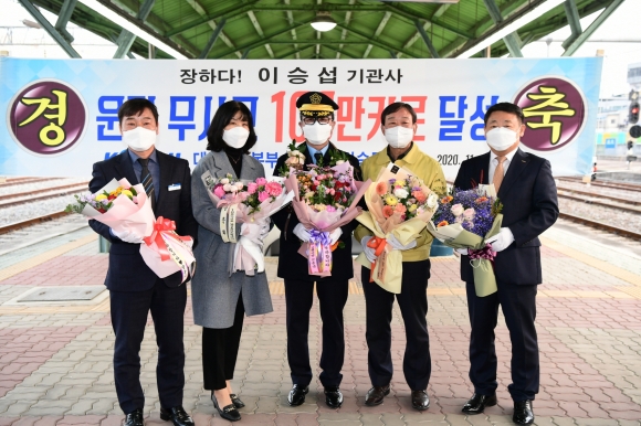 | 코레일 대구경북본부 김천기관차승무사업소(이하 코레일) 이승섭 기관사(55세, 김천시 부곡동)가 무사고 100만km를 달성하는 영광을 안았다. 이승섭 기관사는 철도고를 졸업하고 1985년 9월 16일 철도기관사 일을 시작한 후 35년간 단 한 건의 사고 없이 100만km 달려왔으며, 26일 오후 김천역에 도착하는 제7416호 무궁화열차에서 대기록을 세웠다.