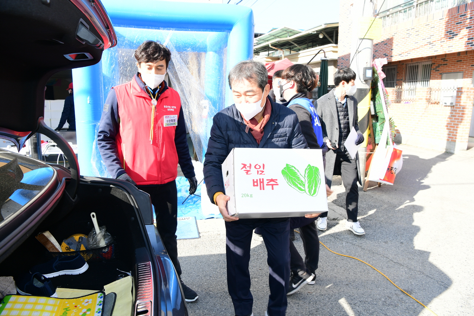 | 제14회 황금시장 김장양념축제가 11월 28일(토) 오전 11시부터 황금시장에서 성황리에 개최됐다. 이번 행사는 코로나19가 재확산 됨에 따라 기존 현장 체험을 드라이브스루(차량 이동식) 방식으로 김장 재료 키트를 배부하여 각 가정에서 체험할 수 있도록 진행됐다. 사전 신청한 200여명 참여자들은 절임 배추와 양념으로 구성된 20kg 김장키트와 수육, 마스크, 경품 등을 차량에서 수령하였다.