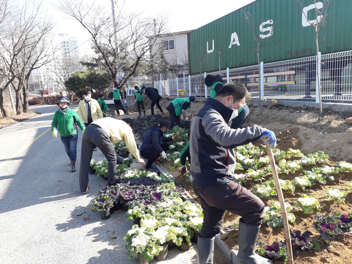 이번 무실마을 입구 연도 변 화단 조성사업에 참여한 지좌동 남·녀 새마을지도자협의회 20여명은 이른 아침부터 꽃배추 1200본을 식재하여 코로나19로 지친 지역 주민들에게 조금이나마 마음의 위로를 전했다.