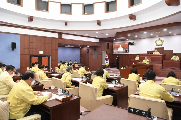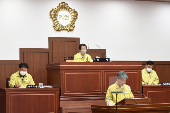 한편, 김천시의회는 코로나 확산 방지를 위해 이날 점심 도시락 식사, 열감지 카메라 설치, 상임위원회 회의실 내 비말 차단용 투명 칸막이 설치 등 더욱 강화된 방역 대책을 마련했다.