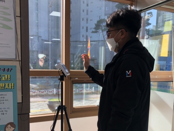 이에 율곡동은 접촉에 따른 감염 위험 요인을 사전에 차단하기 위해 ‘비접촉 열 감지 체온계’2대를 출입구에 설치했다. 장치에 탑재된 시스템으로 이마 또는 손목의 체온을 측정할 수 있으며, 측청 결과 체온이 37.5℃ 이상일 경우 즉시 경보음을 내며 안내 메시지가 나온다.