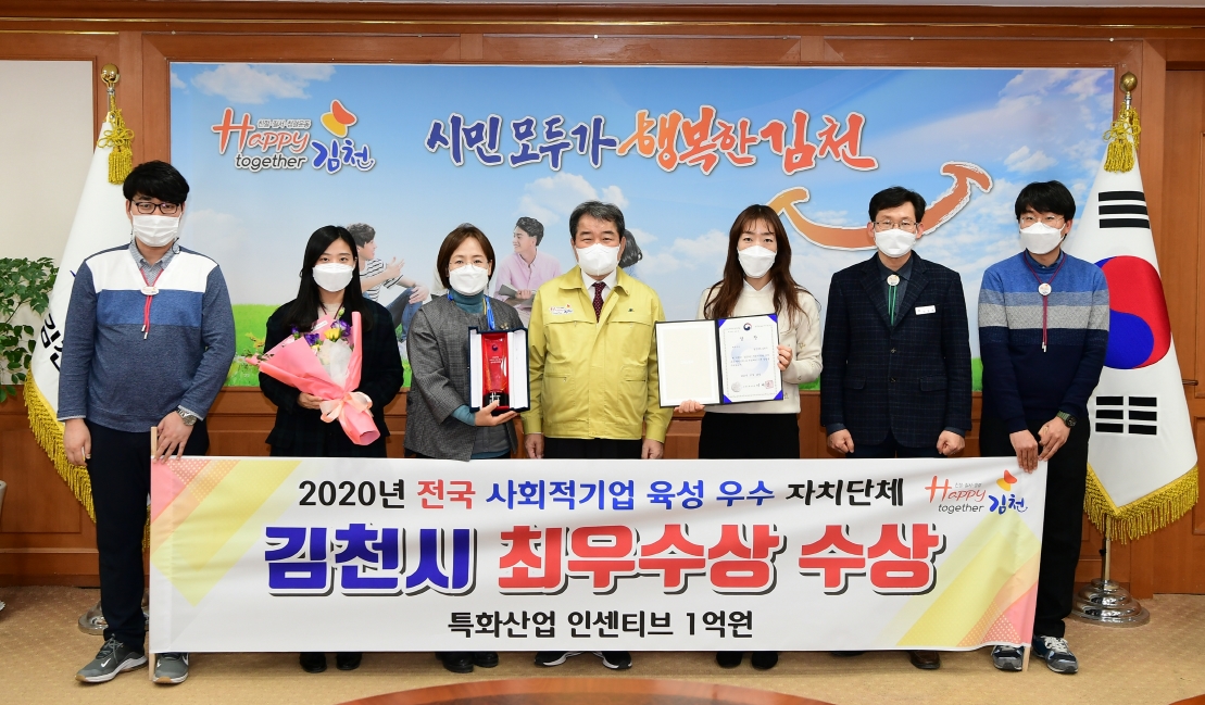 | 김천시(시장 김충섭)의 사회적기업을 육성을 위한 그간의 노력이 전국에서 인정받았다. 김천시는 고용노동부 주관 ‘2020년 전국 사회적기업 육성 우수 자치단체’ 최우수상을 수상하여 기관표창과 함께 지역 특화사업비 1억 원을 받았다.