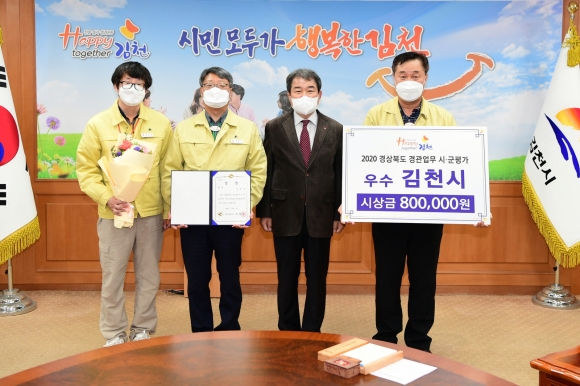 | 김천시(시장 김충섭)는 9일‘2020 경상북도 경관디자인분야(공공디자인, 유해환경개선) 업무실적평가’에서 우수기관 표창을 수상했다고 밝혔다. 이번 평가는 도내 23개 시·군을 대상으로 연간 공공디자인, 유해환경개선, 국․도비 공모사업 추진실적, 시범사업 추진성과, 사업추진력, 관심도, 업무능력 등을 종합적으로 평가해 아름답고 쾌적한 도시 공간 창출에 기여한 우수한 시․군을 대상으로 심사했다.