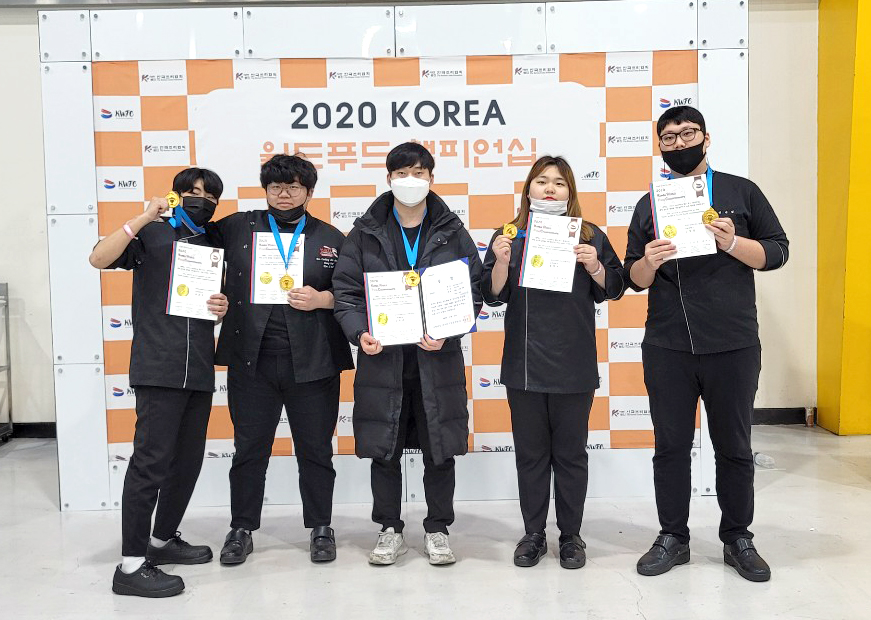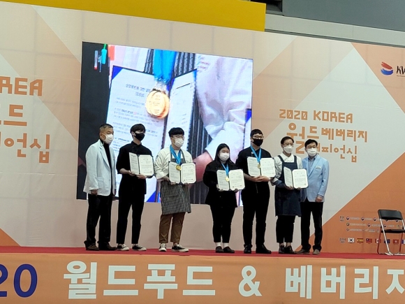 | 김천대학교(총장 윤옥현) 항공호텔조리학부 호텔조리전공 학생들이 지난 11월 12일부터 11월 14일까지 서울 양재동 aT센터 제1전시장에서 개최된 “2020 KOREA 월드푸드챔피언쉽”경연대회에서 라이브 5인1조 팀이 참가하여 라이브단체부문 금상과 한국외식경영학회-장려상(남동균, 장진호, 김일엽, 이준우, 송희주)을 수상하는 쾌거를 거두었다.고 10일 밝혔다.