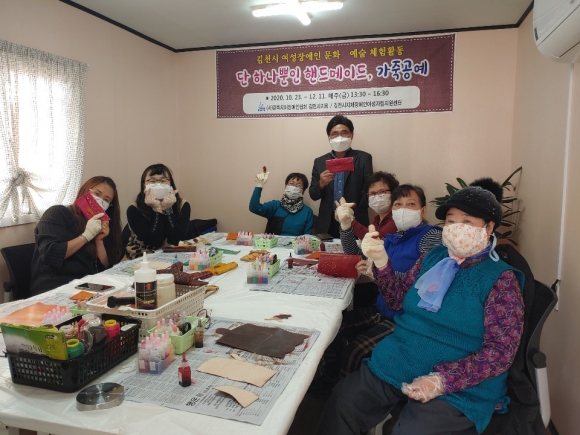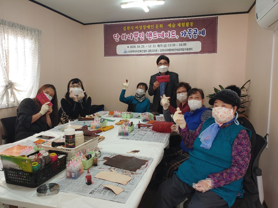 이날 종강식은 여성장애인 및 임직원의 안전한 프로그램 진행을 위해 마스크 착용, 손 소독, 발열 체크 등 감염병 예방수칙을 준수한 가운데 소규모로 진행되었다. 가죽공예 프로그램은 지난 10월부터 12월까지 매주 금요일 총10회에 걸쳐 김천 한국문화센터 김현주 대표의 지도로 진행되었으며, 가죽에 직접 염료를 입히고 한땀한땀 꿰매며 세상에서 단 하나뿐인 나만의 개성있는 소품을 완성하였다.