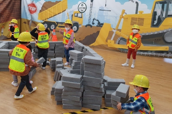 신체활동실에서는 ‘슈퍼히어로’가 되어 다양한 미션을 통과하고 아기원숭이를 구출하는 놀이가 진행되었다. 유아들은 자신의 신체를 조절하여 장애물을 넘어보고, 불빛이 주는 아름다움을 느끼며 즐거운 체험을 하였다. 또 ‘건축사무소’ 테마로 구성된 강당에서는 안전모와 조끼를 입고 친구들과 스펀지 벽돌을 쌓으며 건축물을 구성하는 놀이가 이루어졌으며, 이를 통해 친구들과 서로 소통하고 협력하는 태도를 기를 수 있었다.