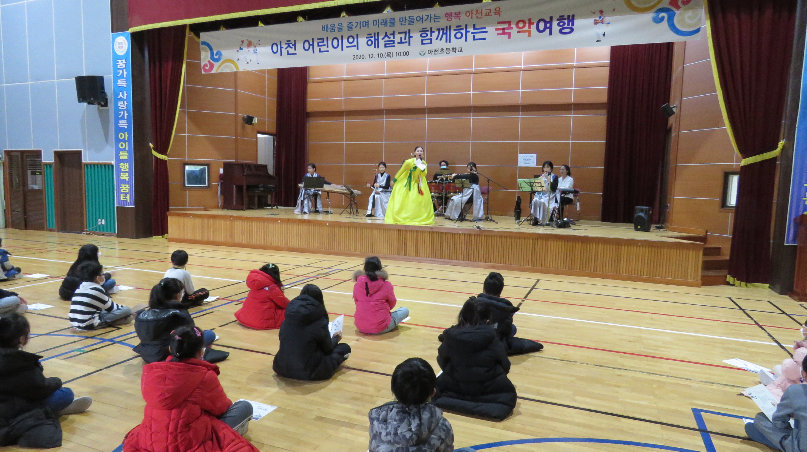| 아천초등학교(교장 이용옥)는 12월 10일(목) 본교 강당에서 본, 분교 전교생이 모인 가운데 국악예술단 ‘예랑’을 초청하여 ‘해설과 함께하는 국악여행’를 실시하였다.