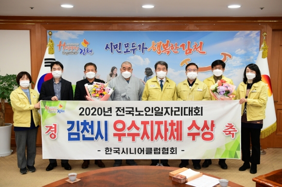 | 김천시(시장 김충섭)는 12월 14일 한국시니어클럽협회에서 개최한 2020년 전국노인일자리대회에서 ‘우수 지자체’로 선정되어 표창을 수상하였다. 한국시니어클럽협회에는 노인일자리지원기관으로 노인일자리사업의 발전을 위해 헌신한 유공자와 우수지자체를 발굴 및 격려하는‘전국노인일자리대회’를 매년 개최하고 있다. 올해 개최식은 우수 지자체 시상과 우수사례 발표를 함께 진행 예정이었지만 코로나19 확산으로 중앙행사를 개최하지 못하고 비대면으로 진행되었다.