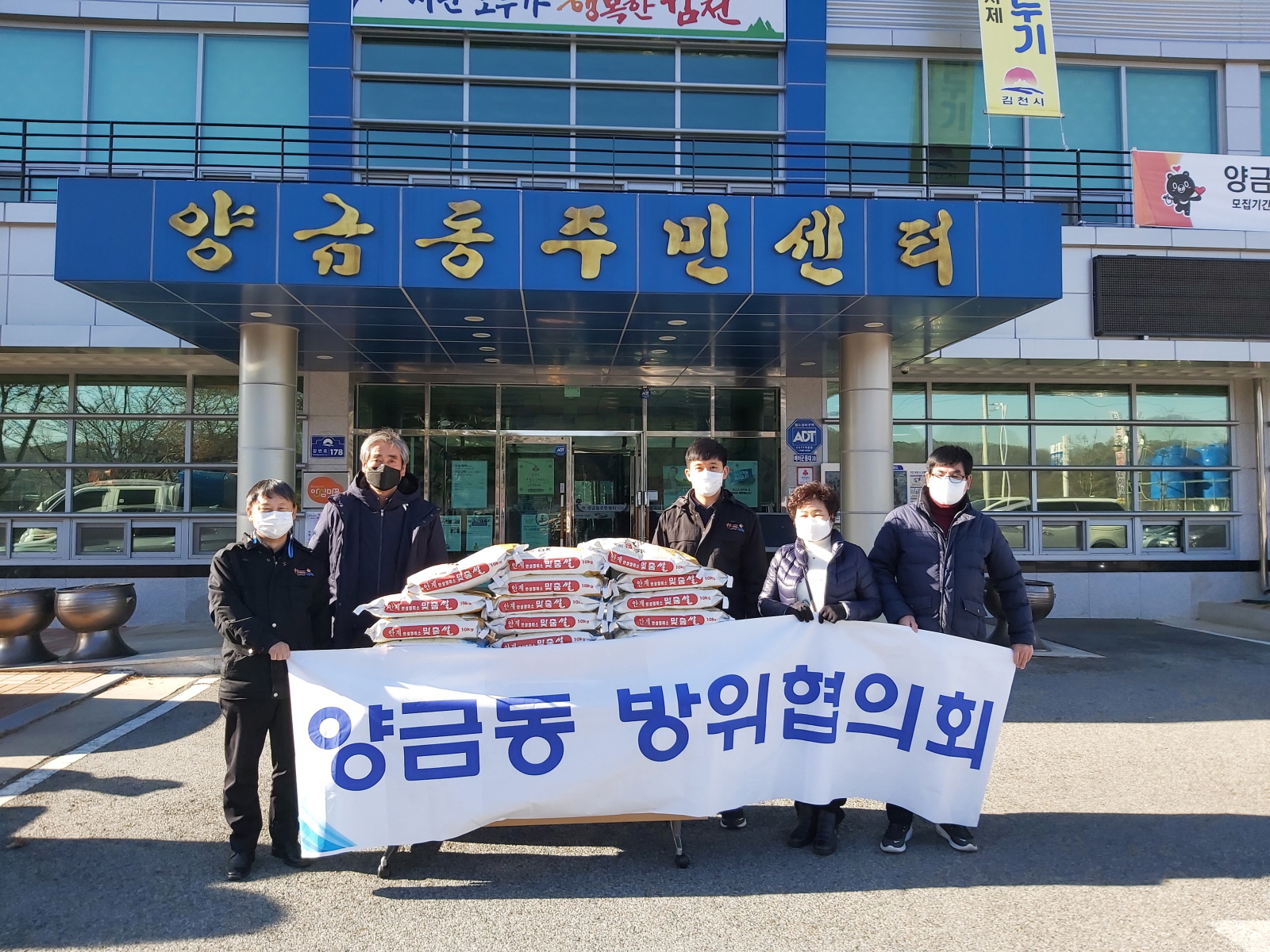 양금동방위협의회는 매년 회원들이 회비를 아껴 따뜻한 지역사회 만들기와 이웃사랑 실천에 힘을 보태왔다. 올해도 회원들이 아껴 모은 회비로 쌀 20포를 주민센터에 기부하였다. 이날 전달받은 쌀은 관내 소외계층 및 저소득 가구에 전달될 예정이다.
