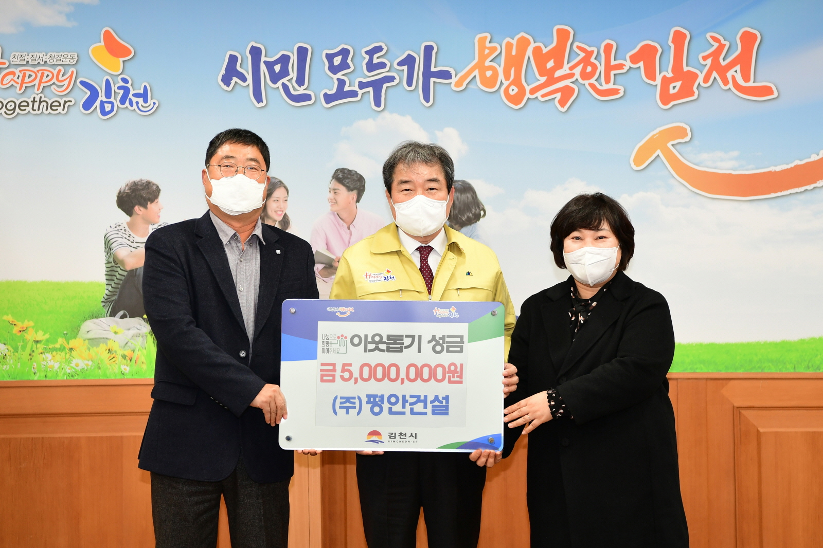 김충섭 김천시장은 “코로나19로 경제적으로 매운 어려운 시기임에도 불구하고 이웃들을 위해 귀한 성금을 기탁해주신 ㈜평안건설 김이용 대표님께 깊은 감사를 드린다. 전해주신 소중한 마음은 어려운 이웃들에게 따뜻한 희망이 되도록 잘 전달하겠다.”고 밝혔다.