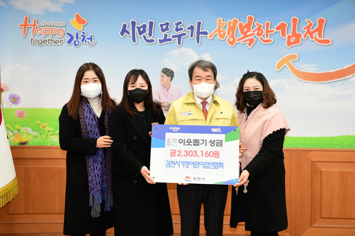 | 김천시 가정어린이집 연합회(회장 이경미)는 22일 김천시청을 방문해 복지사각지대에 있는 어려운 이웃들에게 도움을 주고자 ‘희망2021 나눔 캠페인’사랑의 성금(2,303,160원)을 김천시에 전달했다.