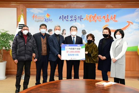 | 참빛봉사회(회장 김주록)는 28일 김천시청을 방문하여 어려운 이웃들을 위해 100만원의 이웃돕기 성금을 전달했다.