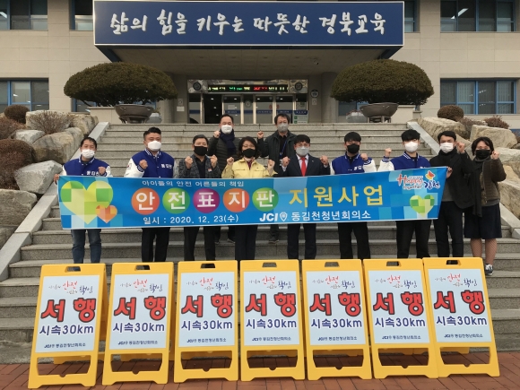 이번에 보급한 교통안전표지판은 동김천청년회의소(회장 손영재)에서 우리 지역 교육기부사업의 일환으로 100개를 제작하여 김천교육지원청에 기부한 물품이다. 특히 ‘아이들의 안전 어른들의 책임’이라는 슬로건을 바탕으로 제작한 이번 표지판은 학교 앞 횡단보도와 어린이 보호구역에서 운전자가 쉽게 확인할 수 있도록 엘로우 색상의 표지판에 레드 색상의 ‘서행 30km’글씨가 들어가 있어 교통사고 예방 및 교통안전문화 확립에도 크게 기여할 것으로 기대하고 있다. 손 회장은 “우리 회원 모두의 따뜻한 마음과 정성으로 이번 사업을 시작하였다.”며 “앞으로도 우리 지역 미래의 일꾼인 학생들의 교육환경을 개선하기 위하여 노력하겠다.”라고 말했다.