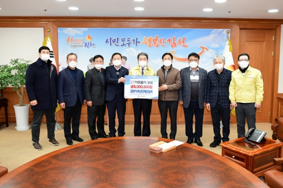 | 김천시 축산단체연합회(회장 김길환)는 연말을 맞아 29일 김천시(시장 김충섭)에 800만원 규모의 연말 이웃돕기성금을 경북사회복지공동모금회를 통해 전달하였다.